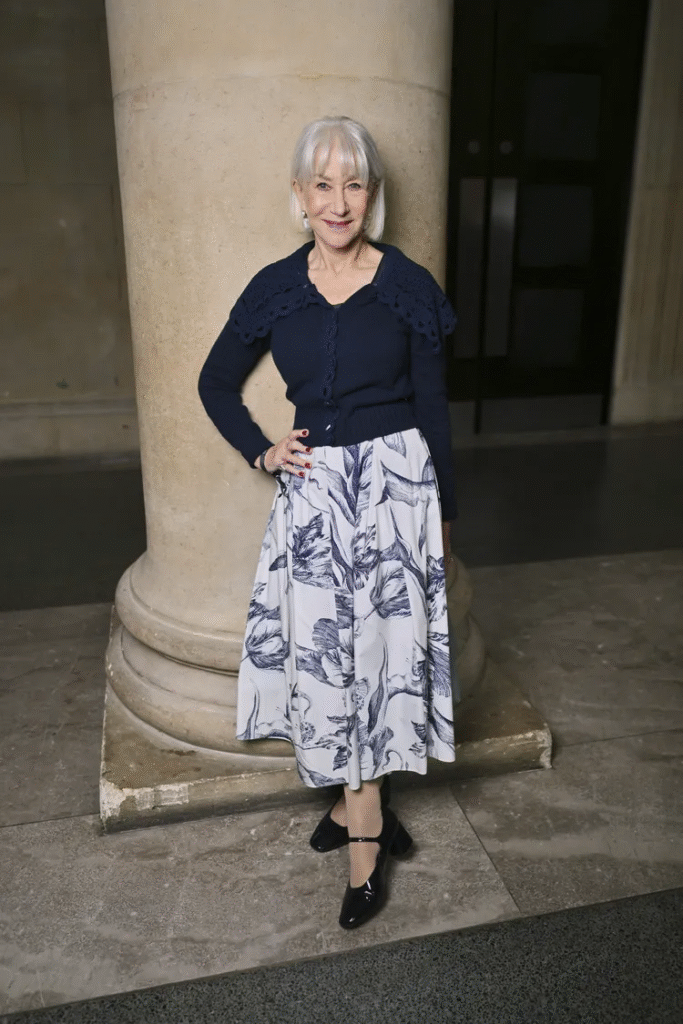 I remember the exact moment I saw the photos. It was a lazy Sunday morning scroll, and there she was: Helen Mirren — age 80, grace in human form — rocking a navy-blue cardigan paired with a floral midi skirt at London Fashion Week. The look itself was effortlessly chic, but what made it special was the confidence that radiated. It wasn’t just a pretty outfit, it was a statement.
