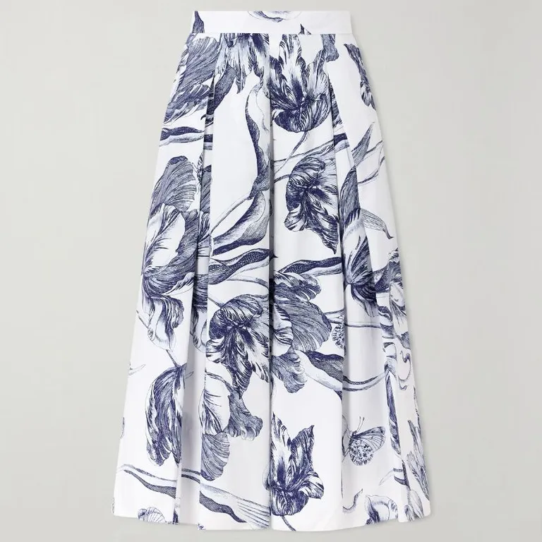 Pleated Floral-Print Cotton-Poplin Midi Skirt