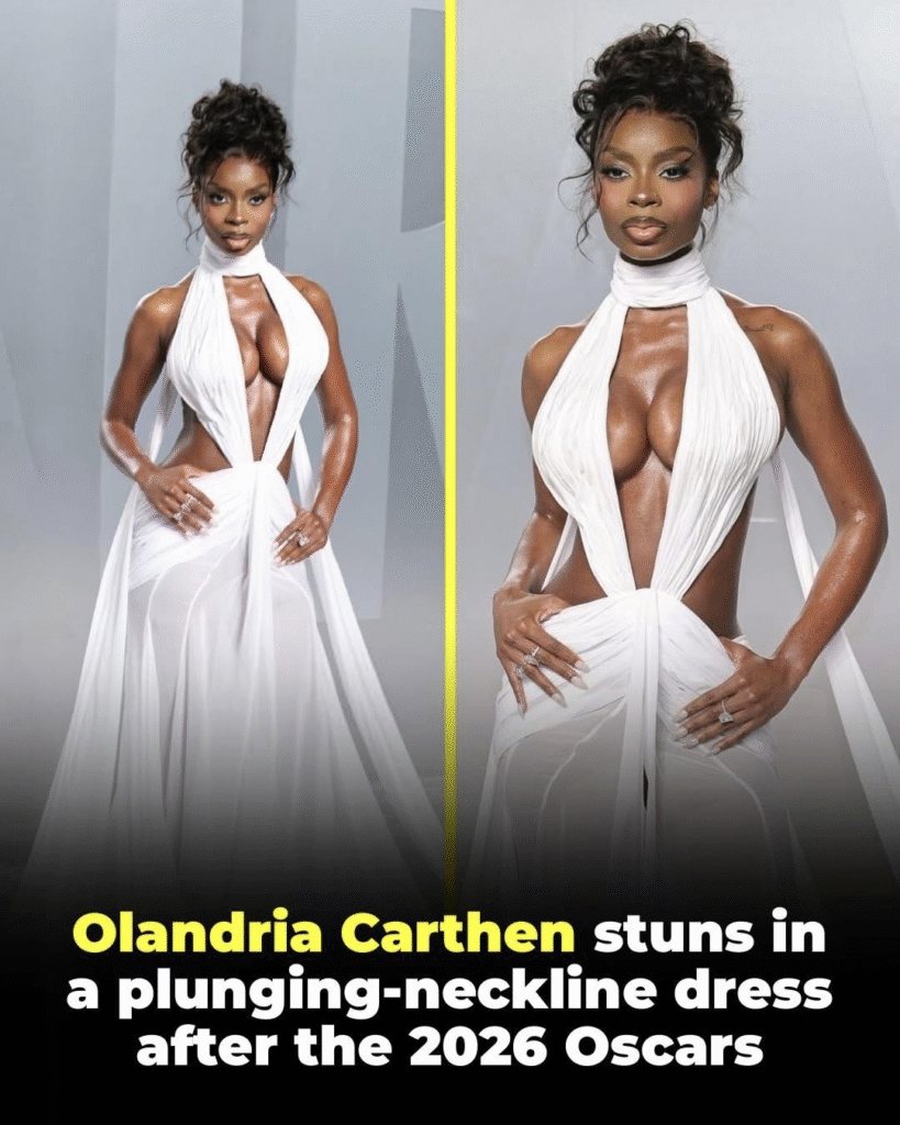 At the iconic Vanity Fair Oscars Party, Olandria delivered a breathtaking fashion moment that instantly went viral. She wore a custom white ensemble featuring a sheer, sarong-style skirt with a dramatic flowing train, paired with a structured wrap-neck top that created a wing-like silhouette.